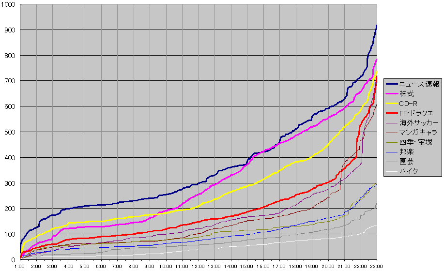 第1位 ニュース速報(919票)![]() 第2位 株式(785票) ![]() 第3位 CD-R,DVD(736票) ![]() 第4位 FF・ドラクエ(717票) ![]() 第5位 海外サッカー(709票) 第6位 漫画キャラ(609票) 第7位 宝塚・四季(301票) 第8位 邦楽(295票) 第9位 園芸(220票) 第10位 バイク(132票) |