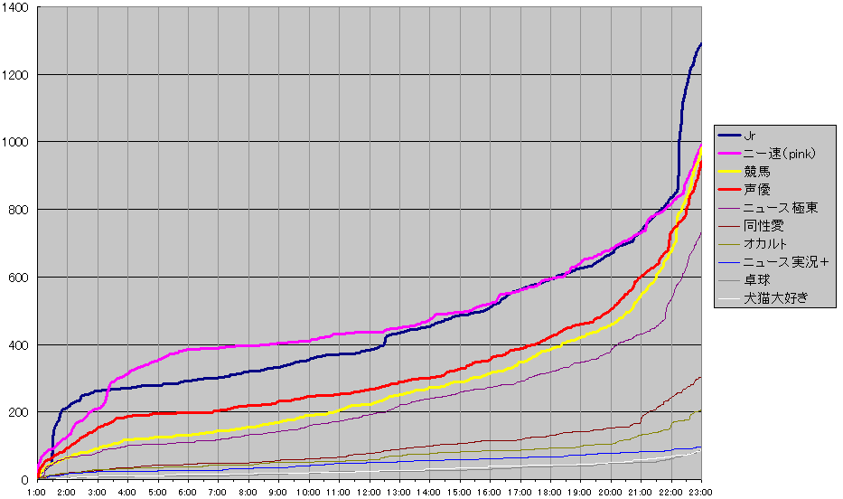 第1位 Jr(1290票)![]() 第2位 ニー速(pink)(991票) ![]() 第3位 競馬(982票) ![]() 第4位 声優(941票) ![]() 第5位 ニュース極東(733票) 第6位 同性愛(305票) 第7位 オカルト(208票) 第8位 ニュース実況+(98票) 第9位 卓球(88票) 第10位 犬猫大好き(87票) |