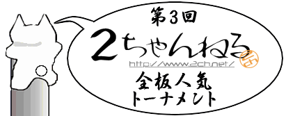 第3回 2ちゃんねる全板人気トーナメントは2008/07/26の決勝戦を持って、全日程を終了いたしました。 多数の支援・投票有難うございました。 http://changi.2ch.net/test/read.cgi/vote/1217079389/104 |