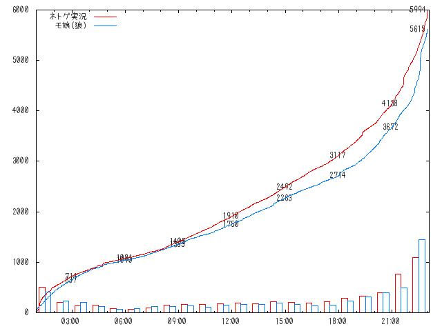 下馬評は狼が圧倒的で、今までの戦績などを見ても、狼が優勝という見方が強かった。 1時に試合開始。 初めにリードしたのはスタートに強いネ実で、スタートダッショなどの大きなラシを重ねるも、完全に先行するには至らず。 狼は各連が奮闘し、試合巧者のメロンexなどのアニメ系の支援を集め、ネ実に食らいつく。 ここで何とか票差をつけておきたいネ実は、投票のペースを落とさずに着々と票を重ねるも、票差は開かないまま、午前中は膠着状態となった。 午後に入り、ラシも増えて投票のペースは上がっていく。 ネ実は徐々に差をつけ、ニュース系のラシや本気ラシなど、大きなラシが集中する21時台へ突入。 狼のラシが少ないこともあり、約400票差をつけることに成功する。 そして、ついに地獄の22時台へ。 先制攻撃は、今まで幾多の強豪を苦しめてきたジャニの直角。 一気に差が縮まり、狼の選対はわきあがり、ネ実は二の足を踏む。 バシーンラシでなんとかリードを保つも、票差は約200。 さらに、22:33:44には、狼渾身の花火ラシ。 投票スレを埋めた美しく巨大な花火で狼がついに逆転。 どMラシやガチホモラシなどで何とか差を詰めようとするが、狼は各連がラシを重ね、リードを保つ。 狼は歓喜し、その勢いのままチンコスラシへ。 さらに狼がリードを広げ、投票所は狼一色にそまった。 その差約150。 まさに怒涛のラシだった。 22:57。 ネ実渾身のブロントラシ。 ここでネ実は150票差を追いつき、試合をひっくり返した。 そのまま数票差でもつれあいながら試合終了。 今大会二度目となるコード発行所の鯖落ちで、確定がなかなか出ない。 焦りが募る両陣営。 速報ではネ実が若干リードするも、偽票もあるため、状況は全く分からなかった。 23:22。 確定 優 勝 5994票 ネトゲ実況 準優勝 5615票 モ娘(狼) 総投票数:11609レス 狼には300の偽票があり、実際にはあの22時台の強さをもってしても追い付くことのできない完全な力負けだった。 ネ実の選対は勝利に歓喜し、居酒屋ガリは祭りとなった。 一方狼の選対は、珍が大量に出没し、深夜まで荒れていた。 やがて珍も消え落ち着いたころ、狼の選対には、選対が解散し家がなくなった2,3人のVIPPERが訪れ、朝まで静かに雑談していた。 そのころの居酒屋ガリは、mukuroのラジオが始まり、うpもあり、祭りはヒートアップして朝まで続いた・・・ 素晴らしい試合を繰り広げたネ実、狼両陣営には、大きな拍手を送りたい。 そして、この祭りに携わったすべての人に大きな拍手を。 以上、駄文ではありますが、VIPのスイカバー大好きな選対名無しがお送りしました。 99 :あるナイトの22時からの記録:2008/07/28(月) 11:54:20