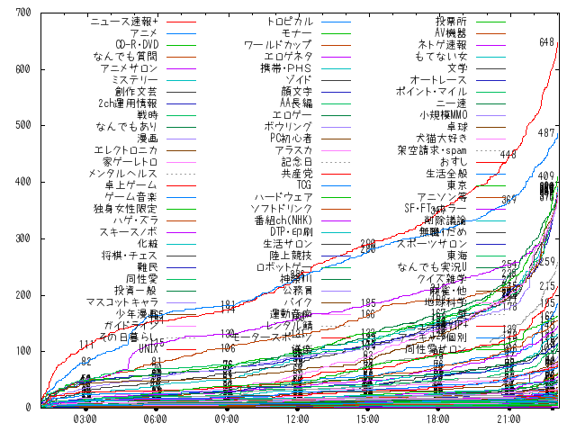 誰にとっても予測不能な未知の領域、本選へと続く細い蜘蛛の糸、運営が開けた禁断の箱。 一度敗れた板にとっての最後の希望、そして最後になるかもしれない戦い。 171の敗者に2の新板を加え、本選への希望をつなげるのはわずか12板。 過酷はサバイバルレースは、始まる前から外交で、宣伝スレで火花を散らす。 01:00、誰も全貌を把握することのできない、今大会最大規模の混沌が、開始された。 最初から飛ばしまくるニュース系&VIP。続いて投票所を埋め尽くすAA。 開始直後勢い良く飛び出したのはニュース速報+。40分で70票を積み上げ、眠れる龍は勢いよく目を覚ました。 次いでアニメ。3位集団からは1歩抜け出したか。 なんでも質問、2ch運用情報、アニメサロン、なんでもありなど1次予選を惜敗した板に新設ながら健闘の戦時を加え3位集団。差は無いに等しい。 その他1次で得票数の多い板が続く。途中集計6レスと、いかに今回の参加板が多いかがわかる。 宣伝スレにも最後とばかりに多数の支援が投下される。その量、質は紹介もできないほど。 4時台にアニメ2板に集中的に票が入り、アニメがニュー速+を抜き1位に、アニメサロンは3位に躍り出た。しかしニュー速+も引き離されはしない。熾烈なトップ争いが続く。上位3板についで、なんでも質問も朝から加速し、4位につける。 なんでも質問、戦時、2ch運用情報、なんでもあり、漫画、CD-R・DVDが5位集団、エレクトロニカ、創作文芸、ミステリーまでがボーダー。やや遅れて卓ゲー、独身女性、家ゲーレトロ、投資一般が夜の追い込みを狙う。 夕方には、支援などにより加速した家ゲーレトロが追いつき、なんでも質問、アニメサロンも集団に飲み込まれる。上位ではニュー速+への投票が増え、独走状態に。 夜、漫画が少し遅れるもラシで持ち直し、13板が12の枠を争う展開に。どの板も気が抜けない。 漫画、なんでもありなどが支援を投下し終える中、エレクトロニカやミステリーが支援とラジオによってボーダーに抗う。 上がり続けるボーダーライン、狭まり続ける3位から13位の差、動き続ける順位。 終了10分前にはボーダー330を超え、5位から13位までが16票差の中にひしめく大混戦に。 多くの板の最後の外交最後の支援、各板の思惑が行き交う中、携帯電話のコード発行所のサーバにつながらなくなった人も。 ぎりぎりの状況の中、投票は終了。こぼれたのは————家ゲーレトロ 373票。12位とは僅か3表の差。 ユニークな挨拶を展開したハゲ・ヅラ、読みやすい支援物資のスキースキーなど、数多くの板と共に、ここで姿を消した。 ![]() |