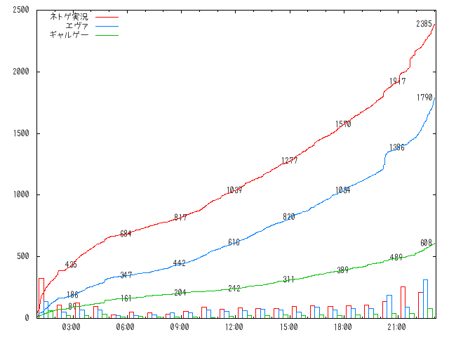 C2組:ニュー速VIP シベリア超速報 モバイル D2組:エヴァ ネトゲ実況 ギャルゲー 優勝候補筆頭のVIPと、ニュース系板の心の拠り所となっているシベリアが激突することで、 本戦1回戦では、もっとも注目された対決となった。 午前1時、投票所及び各選対は、異様な熱気が包まれる中、戦いの火蓋が切られた。 ニュース速報は総力をあげてシベリア支援に回って、驚異的なペースで得票を重ねるVIPに食らいつく。 激しい鍔迫り合いを演じる中、ν即選対が積極的に動き、深夜に強いアニメサロンexと連携しながら、 定例ラシに突発ラシを織り交ぜて、VIPの勢いに対抗する。 各選対で偽票の存在が囁かれる中、表面上は互角の展開が続き、次第に圧倒的な優勢を確信していた VIP選対に焦りのコメントが多くなる。 VIP板内の掘り起こしに効果が出たのか、一時は200票超の差をつけたと報じられるが、 シベリアも驚異的な粘りを見せて150票前後の差で膠着状態が続く。 午後8時を回り、シベリアの線路ラシと、エヴァ主催のサードインパクトラシで一気に差が縮まる。 シベリア全力支援中のν即は歓喜にわき立ち、VIPは悲鳴をあげる。 午後9時以降、各板のラシが集中する時間となって、投票所のコードが取れない、 又は取りにくいという悲痛な叫びがあがる。 取得困難な状態は改善されず、午後10時以降は、取得がほぼ不可能となってしまう。 結果、今までに取得したコードのみで終盤のラシを実施しなければならなくなったが、 悪影響をもろに食らったのはシベリアではなくて、自板票の掘り起こしによる投票に重点をおいていたVIPだった。 午後10時以降にVIP票の伸びが止まってしまい、投票所はシベリア一色となる。 ジャニーズ、FF・ドラクエ、既婚女性、D2組で出場しているネトゲ実況、 シベリアの最大の支援板となっているν即、最萌エントリー日程をずらしたex、予選でVIPに次ぐ票を叩き出した狼、 第1回覇者のDownloadが、各ラシで主にシベリアに票を投じたことにより、急速に引き離される。 そして、発行所が復活しないままに投票が終了。 (※仮集計) C2組 シベリア超速報 3767 ニュー速VIP 2927 モバイル 340 D2組 ネトゲ実況 2385 エヴァ 1790 ギャルゲー 608 VIPは800もの偽票を叩き込まれており、実際はシベリアに終始リードされる完敗だった。 また、VIP票の3分の2が、単記(D2組には投票せず)であった為、ネトゲ実況とエヴァ両方の票が、 シベリアに回ってしまった。 ν即の献身的な支援を抜きにして、シベリアの勝利は語れないが、シベリア選対も、 細やかな板回りを重ねており、広い範囲で好感をもたれていたことが金星につながった。 D2組は、ネトゲ実況が手堅い戦いぶりを見せて2回戦に進出。 エヴァは、サードインパクトラシで鋭い切れ味を見せたものの、序盤の劣勢を覆すことができずに2着。 C2組のモバイルは、2強の煽りをもろに受けて票を伸ばすことができず、 D2組のギャルゲも厳しい戦いを強いられた。 本命視されたVIPの早すぎた退場によって、全板トナメは本命不在の混沌とした状況となった。 ![]() |