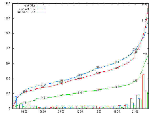 面子はバカニュース、モ娘(鳩)、痛いニュース ニュース系列の被りが痛いと思われたが、裏のニュース速報が連記先をバカニュースに統一、 強力な連記効果で戦況は終始バカニュースが圧倒しているように思われたのだが・・・ 鳩も自板のラシや狼の支援で対抗するも追いつけず、終了時点での集計結果はこうであった 1位 1796票 バカニュース 2位 1374票 モ娘(鳩) 3位 700票 痛いニュース+ バカニュースの圧勝か・・・そう思った矢先各陣営に戦慄が走った! 166 名前:植輪 ◆va2IMJXmjM [] 投稿日:2008/06/24(火) 23:20:09 ID:VVw5+/FN 本日の投票結果です。(確定) F1組 有効コードがある票の順位 1位 1386票 モ娘(鳩) 2位 1171票 バカニュース 3位 722票 痛いニュース+ なんとバカニュースに625票もの無効票が入っていたのだ! まさかの鳩の大逆転、両陣営は唖然となった・・・ 裏で悲願の一回戦突破を果たしたニュース速報もあまりの事態に勝利を喜べない状況だった・・・ ![]() |