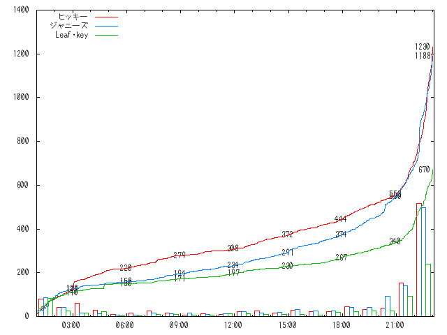 ラシの効果もあってだんだんとジャニーズ板がヒッキー板との差を詰める。