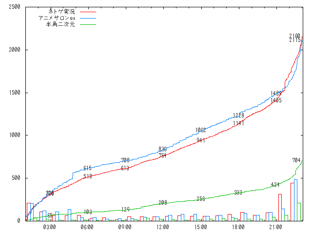 Dブロック決勝 ネトゲ実況 アニメサロンex 半角二次元 強豪同士がぶつかり、開始前から大激戦が予想される組み合わせ、 特にネ実とexは今大会で特に目立っており、台風の目的な存在だ。 両者は死の組と呼ばれた二次予選7組で激闘を繰り広げており 彼らにとっては因縁の再戦になる。ついに両板の決着の時が来た。 二次予選7組、スロットサロン、競馬、FFDQなどの強豪板が名を連ねる中、 一位を争うデッドヒートを繰り広げたネトゲ実況とアニメサロンex。 この戦いで彼らの知名度は全板に轟いたのである。 結果は アニメサロンex 846 ネトゲ実況 741 ネ実はexに一歩及ばなかった。これはネ実にとってはリベンジの一戦ともなる。 両板は本戦一回戦で2000票以上を獲得した数少ない板であり、 その他の板はシベリア超速報、VIP、Download、狼だけだった。 各陣営もこの一戦には注目しており、投票前から異常な賑わいを見せていた。 68 :名無しさん:2008/07/06(日) 23:39:14 1:00戦いの火蓋が切られる。 開始直後から怒涛の投票ラッシュが始まる。 ネ実、exのスタートダッシュで次々とスレが消費される。 開始直後はexの「一番ノリ部ラシ」でリードしていたが、1:10「ネ実スタードダッシュラシ」で逆転される。 半角二次元は早くも置いていかれた印象である。 exはこの一日で40以上のラシを計画しており 短い間隔で次々とラシを繋いでいくが、中々差が縮まらない。 この大量のラシにゲハ、ポケモン、ネ実、西日本らが頑張ってついていったのがとても印象的だった。 この大接戦の試合展開に大手もノリ始める。 exは本戦一回戦で狼に317票の支援をしており、 それにちなんだ狼の3:17のラシに突然VIPが乱入、投票所は狼とVIPが交互に並んだカオス状態に・・・ 507 名前:名無し募集中。。。[] 投稿日:2008/07/06(日) 03:17:36.51 0 なんかVAP混じってるぞw 508 名前:名無し募集中。。。[] 投稿日:2008/07/06(日) 03:17:42.61 0 VAP混じっててワロタ 509 名前:名無し募集中。。。[] 投稿日:2008/07/06(日) 03:17:56.78 0 なぜVAPが 510 名前:名無し募集中。。。[] 投稿日:2008/07/06(日) 03:18:07.98 0 なんであんないっぱいVAPいるんだよw 思わぬ合同ラシにノリにのったのか、VIPと狼はVIPvs狼の突発ラシを企画! 前回狼とVIPは総投票数18000を超える全板最大の争いを繰り広げた。 今回VIPが一回戦で思わぬ敗退をしてしまったため、ここで再戦しようという企画である。 こんな時間にも関わらず、あっという間にスレを消費!! 狼がex支援だったため、ここでついにexが逆転!! これに影響を受けたネ実ex両陣営は、ネ実vsexの突発ラシを4:30に企画 ところがVIP狼が乱入し、思わぬ大規模ラシに・・・ この突発ラシ合戦でexの得票が伸び、4:44の西日本の4取りラシでさらに大差をつけた! 69 :名無しさん:2008/07/06(日) 23:40:58 これ以降はしばらくexがリードする展開が続く。 ネ実が差しそうになるも、またexのラシで離されるというのが繰り返される・・・。 exの連続ラシには、さすがのネ実もなかなか食らいつけない。 exの強みは全板屈指の強豪板狼がついている事であろう。 狼との合同ラシ「きらりさんマジ最高!ラシ」でさらにネ実を離す。 だがネ実も負けてはいない。 他板からの豊富な浮動票を獲得し、安定したペースで徐々に票差を縮める。 それにしても両板とも2000票超えは確実の速いペースである。 半角二次元は前日の半角文字列の敗北が効いているのか、いつのまにか1000票差もつけられてしまった。 ネ実exゲハ他板の間で次々と突発ラシが企画され そのラシの多さにあたふたする人も・・・ その状況をネタにした「ラシが増えるよラシ」まで作られたw 徐々に差を詰めるネ実、 ついに21:38のネ実本気ラシで一気に突き離した! 一瞬で埋まった投票スレを見てex陣営が焦り始める。 そして残り一時間を切った時、両陣営はラストスパートに入った ネ実がリードを保っているものの、中々exを離せない 両者一進一退の攻防が続く。 22:08:30 changi鯖ラシ 22:17:00 exネ実ゲハの合同企画 ゲハガリオン このとき初めてゲハガリオンが完成した 22:36:18 アニメサロンex板本ラシ exはここで差を一気に縮めるも逆転には至らず 22:42:00 ドMラシ 22:48:00 FFDQガリ合同ラシ 22:49:00 まだいけるラシ 22:53:00 真紅 何故・・・これはどういうことなのラシ 22:54:54 チンコスラシ ここで狼からexに大量の票が入り、勝負は最後までわからない状況に 22:57:00 借金姉妹ラシ ガリ陣営の最後の攻撃 そして試合終了!!!! 70 :名無しさん:2008/07/06(日) 23:50:49 結果 07/06 総投票数:4979レス 有効コードがある票の順位 1位 2160票 ネトゲ実況 →→ベスト8進出! 2位 2115票 アニメサロンex 3位 704票 半角二次元 勝利の女神はネトゲ実況に微笑んだのだった。 蓋を開けてみれば45票差の大接戦だった。 グラフを見てみればわかると思うが、 本気ラシでネ実が突き離して以降もじわりじわりとexが追い上げている。 ネ実はなんとか逃げ切り、わずかの差で勝負がつく形となった。 本当に良い試合だった・・・・ ネ実に次々と各板からお祝いが届く。 exも負けた後