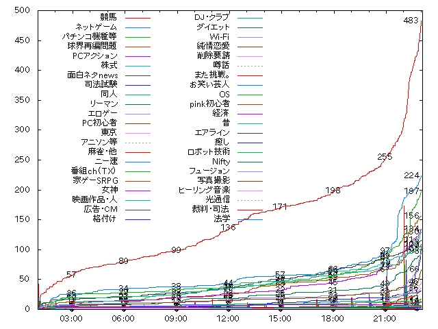 ここまでインフレし続けてきた投票数が最高潮になる可能性もあり、どの板も気が抜けない組となった。 出走前の予想では浮動票を集める競馬、投資系の支援と平日であることが強みになる株式が鉄板。 ニュー速VIPの傍系ニー速、ゲーム系からネットゲーム&家ゲーSRPG、力がある板だが時期が悪い司法試験、ヤッキッキーのマスコット外交もある球界改革議論、新規参加だがやる気十分パチンコ機種等&PCアクション、支援物資が出てくれば面白い面白ネタnews、人口の多い同人&リーマンなど、互いに相手するのに不足は無い。 開始前から宣伝スレでパチンコ機種等がPV投下、球界改革議論が板紹介。パチンコ機種等の支援は終わりが見えないものの、昼までに株式ミニ先物、競馬列伝、隠してないネトゲ板支援が続く。 投票スレに目を転じると、先行競馬の一人旅。日々の新聞配達の成果か。 二位以降は団子。ネトゲ、同人、パチ機種等、面白ねたnews、対抗視されていた株式もやや低調でこの位置に。 他通過を予想された板が続く。ただニー速、司法試験、家ゲーSRPGはやや出遅れ。 しかしまだ総得票数が少なかったため、やはり決戦は夜の部に。 他に目を向けると、昨日予選通過した相撲板のAA切り職人がひたすらAAを切り続けていた。 夜になり、まずはスロ2027ラシ。パチ機種などにスロ系からの投票が目立つ。東京がゆるキャラ近藤くんで各板を回り始め、麻雀も敗者復活を目指して活動を活発にする。アニソン垂れ流しも始まっていた。宣伝スレでは球界改革議論、格付けなどの支援が入る。全体としては8位球界改革議論までと9位リーマンとに差がつく。 22時を過ぎ、上位各板がラシを開始し始め順位の変動が続く中、気になるのは一次予選の見所10位争い。 PC初心者、エロゲー互いに譲らず、司法試験、ニー速、東京などが追う。リーマンは9位に落ち着いたか。 果たして最後の一次予選突破板となるのはどこの板か? ラスト10分で9位リーマンを10位エロゲー11位司法試験が猛追する。PC初心者はやや遅れた。ラスト3分、10位11位の差はわずか2票———。 そして結果発表。 1位競馬、終始一人旅の強さを見せた。末足も未だ健在。 2位以降順にネットゲーム、パチンコ機種等、球界再編問題、PCアクション、株式、面白ネタnews。 夜のラシで激しく競り合ったがこの順位に落ち着く。 8位司法試験、この板が12位からここまで伸びると誰が予想したか。 9位同人、順位落とすも危なげないが、10位リーマン、こちらは冷や冷や3票差。 11位エロゲー、わずか届かず復活戦へ、12位PC初心者、最後の伸びに欠きこの順位に。 他東京、アニソン等、麻雀・他、ニー速、番組ch(TX)、家ゲーSRPG、女神、映画作品・人、広告・CMが敗者復活戦行きとなった。 ![]() |